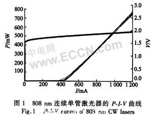 本試驗(yàn)分別在40、80下對(duì)20只隨機(jī)抽取的波長(zhǎng)808 nm的無(wú)Al連續(xù)輸出功率為1 W的單管激光器進(jìn)行1.2 A恒流老化。老化前抽出10只在室溫下進(jìn)行P-I-Y測(cè)試,如圖1所示。