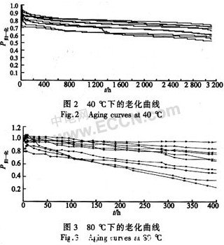 將數(shù)據(jù)代入式(2)、(3)可以解出Ea=0.52 eV/#p#分頁(yè)標(biāo)題#e#K,τ=25.2(相對(duì)于80)。進(jìn)而,可以計(jì)算出中值壽命tm=330×25.2=8 320 h。
