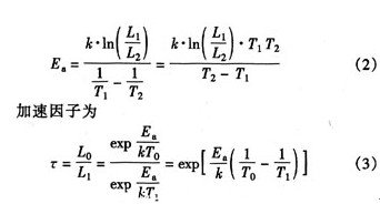 式中,L為壽命,#p#分頁(yè)標(biāo)題#e#Ea為激活能,A為常數(shù),k(8.62×10-5eVK)為波爾茲曼常數(shù),T為熱力學(xué)溫度。確定了失效模式的激活能以后,就可以得出加速系數(shù)τ。設(shè)室溫T0下壽命為L0,加速試驗(yàn)中溫度T1下壽命為L1,溫度T2下的壽命為L2(T2>T1),則激活能的計(jì)算式為