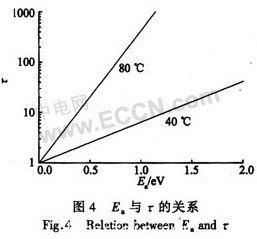 不同溫度下Eaτ的關(guān)系如圖4所示,不同溫度下,溫度越高,曲線斜率越大,加速效果越明顯;相同溫度下,激活能越大,加速系數(shù)越大。由于失效機(jī)理不同,激活能也不一樣。