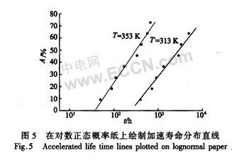 在對(duì)數(shù)正態(tài)分布概率紙上繪制把激光器的加速壽命分布曲線,如圖5所示。橫坐標(biāo)是激光器的壽命,縱坐標(biāo)是累積失效率(A)。通過(guò)圖中的點(diǎn)可以近似畫(huà)出兩條互相平行的線,這就說(shuō)明,半導(dǎo)體激光器的壽命分布屬于對(duì)數(shù)正態(tài)分布形式,而且加速壽命試驗(yàn)確實(shí)是真實(shí)有效的加速了。