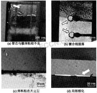 與燒結(jié)有關(guān)的退化。管芯與載體粘結(jié)特性不好,很容易與載體分離,歐姆接觸不好不僅增加熱耗散功率而降低激光器的效率,而且會(huì)引起局部過(guò)熱。使上述接觸電阻進(jìn)一步增加,造成引線脫落等,如圖6(a)、(b)所示;另外,銦焊料過(guò)多使在加熱焊接或在后面的加速老化試驗(yàn)中焊料淹浸解理面,而使激光器輸出功率減小或無(wú)輸出,如圖6(c)所示。