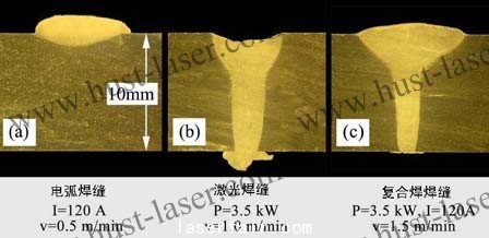 電弧、激光及復合焊縫截面形貌對比