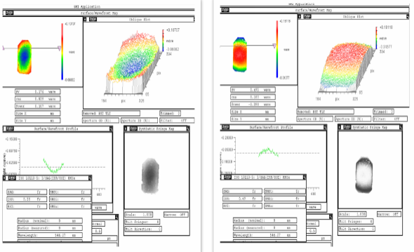 鏡片的表面精度會直接影響到打標(biāo)的最終結(jié)果,所以做到盡可能好的表面精度是至關(guān)重要,然而在鏡片加工過程中并不能達(dá)到絕對的平整,我們一般會按照鏡片圖紙要求的表面精度例如:1/0.5或是3/1等進(jìn)行加工,使得鏡片表面精度盡可能的滿足設(shè)計(jì)要求。反射鏡表面的凹凸特性也會對光束的質(zhì)量有很大的影響,我們通過干涉儀對光學(xué)表面進(jìn)行測量,通過干涉儀給出的3D圖像,會發(fā)現(xiàn)鏡片在滿足平整度要求的同時,也會出現(xiàn) 凹面或者凸面的狀況,俗稱低光圈和高光圈。如果鏡片表面精度的要求為1 / 0.5。在圖一中,兩個鏡片的數(shù)值分別以0.352 / 0.28和0.99 / 0. 49均在要求范圍以內(nèi),但這并不意味著兩個鏡片掃描的效果都符合要求。輸出光束的質(zhì)量好壞,取決于鏡片的凹凸特性。凸面狀態(tài)會引起光束產(chǎn)生發(fā)散現(xiàn)象,使得聚焦點(diǎn)變大。而凹面鏡使得光斑會聚,從而產(chǎn)生更好的聚焦光斑和更強(qiáng)的能量。