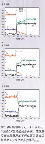 portant; word-wrap: break-word !important;">       在照射表面以不同深度在NiTi-SS界面執(zhí)行的量化能量彌散X射線譜(EDS)曲線參見圖5a–5c。兩種基材金屬成分之間的連接區(qū)域顯示了Fe、Cr、Ni和Ti之間的混合物。該混合區(qū)域的范圍表明了接頭的寬度。這種特定樣品顯示接頭寬度范圍大約在5–25 µm之間。不同的成分曲線形狀表明不同的焊接機(jī)制沿著接頭的不同區(qū)域占據(jù)主導(dǎo)。面向激光照射表面的熔化層厚度更大,表明熔化持續(xù)時(shí)間更長(zhǎng),能夠?qū)⒏嗖讳P鋼稀釋入熔化NiTi。觀察到面向金屬絲中心的兩種材料的熔合最小,熔化層厚度可以大幅降低。該區(qū)域的成分曲線類似于擴(kuò)散控制工藝,但是上層類似于基于熔化的連接機(jī)制。圖5還顯示接頭寬度大幅低于400µm的光束聚焦尺寸,因此確認(rèn)接頭形成的機(jī)制不是激光光束直接熔化,而是需要的熱量聚積。