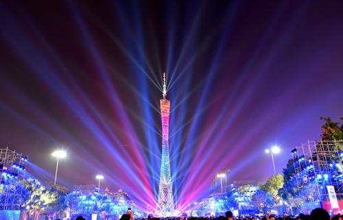 11月26日晚7時(shí),2018年廣州國(guó)際燈光節(jié)(以下簡(jiǎn)稱“燈光節(jié)”)以簡(jiǎn)單的亮燈儀式配以廣州塔燈光秀拉開(kāi)燈光節(jié)的帷幕。1號(hào)作品—“時(shí)代·力量”,配以廣州塔燈光秀,通過(guò)激光束在廣州塔為中軸線的高層建筑之間來(lái)回穿梭,勾勒出從清晨太陽(yáng)升起照亮廣州一段浩瀚的畫面,點(diǎn)亮珠江新城,進(jìn)入人們匆忙工作的腳步,不停的快節(jié)奏的追著時(shí)間賽跑,再到休閑生活的快樂(lè)氣氛 ,展示一個(gè)個(gè)壯觀的生態(tài)畫面,寓示現(xiàn)在的美好生活。