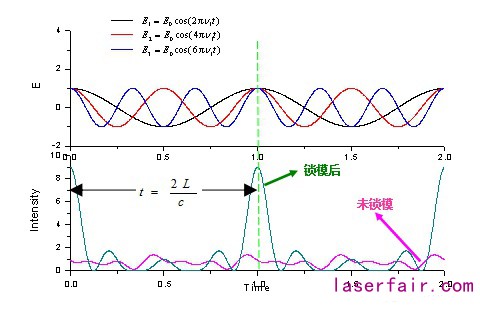 鎖模原理圖示:圖中出現(xiàn)一系列周期性的脈沖,當(dāng)各光波振幅同時(shí)達(dá)到最大值處時(shí),由于“建設(shè)性”的干涉作用,就周期性地出現(xiàn)了極大值。