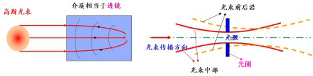 基模高斯光束具有中心光強(qiáng)強(qiáng),周圍逐漸減弱的特點(diǎn),因此高斯光束經(jīng)過增益介質(zhì)時(shí),中心折射率大,周圍折射率小,使得介質(zhì)出現(xiàn)類似于透鏡的效果,實(shí)現(xiàn)光束的聚焦,也就是自聚焦效應(yīng)。若在高斯光束腰斑附近放一個(gè)光闌,則光束前后沿的損耗大于光束中部的損耗,使得強(qiáng)光占據(jù)的中部得以通過放大,而周圍的光束則被損耗。光闌和自聚焦效應(yīng)的結(jié)合可以看成一個(gè)快飽和吸收體,即強(qiáng)光漂白,弱光被損耗,由于諧振腔的作用,其調(diào)制也是周期性的,使得脈沖周期性的輸出。