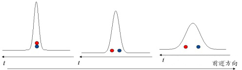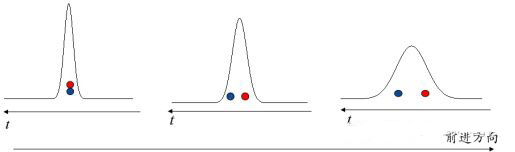 同理,反常色散中光的群速度同頻率成正比,可等效為頻率小的光速度小,頻率大的光速度大。初始位置相同的紅光和藍(lán)光在反常色散介質(zhì)中傳播一段時(shí)間之后紅光在厚藍(lán)光在前,從而造成脈沖展寬。