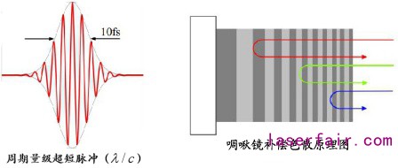 啁啾鏡壓縮脈沖:通過在啁啾鏡表面鍍不同中心波長反射膜,使得不同中心波長的光穿透深度不同,從而引入不同的延時(shí),例如經(jīng)過正常色散的光到達(dá)啁啾鏡時(shí),可使低頻光穿透深度更大,高頻光穿透深度更小,即可使得低頻光延時(shí)大于高頻光,從而實(shí)現(xiàn)色散補(bǔ)償。根據(jù)系統(tǒng)的總色散量精密的計(jì)算鍍膜的層數(shù)和厚度,啁啾鏡可實(shí)現(xiàn)超寬光譜的色散補(bǔ)償,即可實(shí)現(xiàn)周期量級(jí)的超短脈沖。