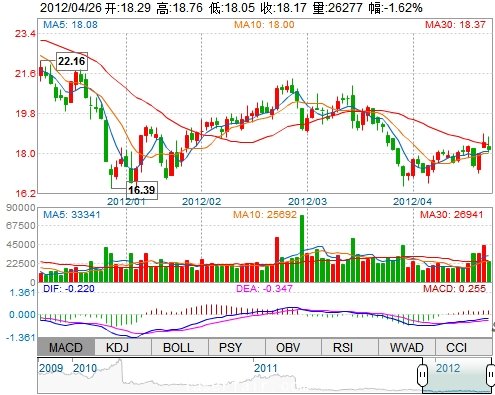 今 開: 18.29 成交量: 26277手 振 幅: 3.84% 最 高: 18.76 成交額: 4815.90萬 換手率: 1.28% 最 低: 18.05 總市值: 54.08億 市凈率: 4.45 昨 收: 18.47 流通...