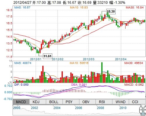 今 開(kāi): 17.00 成交量: 33209手 振 幅: 2.42% 最 高: 17.08 成交額: 5582.66萬(wàn) 換手率: 0.81% 最 低: 16.67 總市值: 74.36億 市凈率: 2.82 昨 收: 16.91 流通...