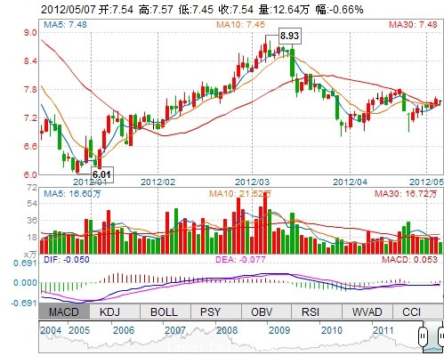 今 開: 7.54 成交量: 126437手 振 幅: 1.58% 最 高: 7.57 成交額: 9506.41萬 換手率: 1.34% 最 低: 7.45 總市值: 78.75億 市凈率: 2.65 昨 收: 7.59 流通市值...