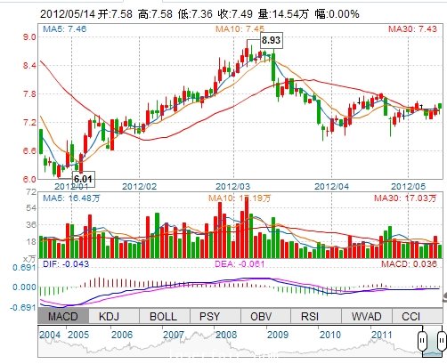 今 開: 7.58 成交量: 145446手 振 幅: 2.94% 最 高: 7.58 成交額: 10897.61萬 換手率: 1.54% 最 低: 7.36 總市值: 78.23億 市凈率: 2.63 昨 收: 7.49 流通市...