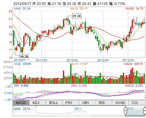 今 開: 20.56 成交量: 41135手 振 幅: 3.89% 最 高: 21.18 成交額: 8529.31萬(wàn) 換手率: 2.01% 最 低: 20.38 總市值: 60.75億 市凈率: 5.00 昨 收: 20.56 流通...