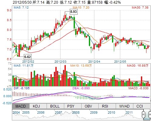 今 開(kāi): 7.14 成交量: 87157手 振 幅: 1.11% 最 高: 7.20 成交額: 6234.80萬(wàn) 換手率: 0.92% 最 低: 7.12 總市值: 74.67億 市凈率: 2.51 昨 收: 7.18 流通市值...