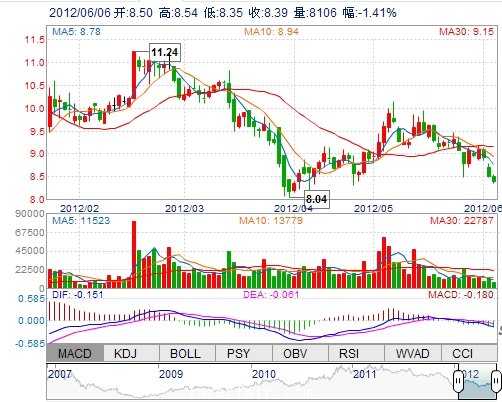 今 開: 8.50 成交量: 8105手 振 幅: 2.23% 最 高: 8.54 成交額: 685.13萬 換手率: 0.42% 最 低: 8.35 總市值: 16.72億 市凈率: 3.47 昨 收: 8.51 流通市值: ...