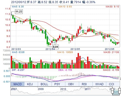今 開(kāi): 8.37 成交量: 7913手 振 幅: 2.01% 最 高: 8.52 成交額: 668.49萬(wàn) 換手率: 0.41% 最 低: 8.35 總市值: 16.76億 市凈率: 3.48 昨 收: 8.44 流通市值: ...