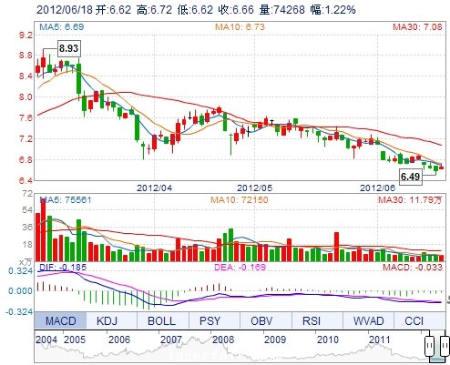 今 開(kāi): 6.62 成交量: 74267手 振 幅: 1.52% 最 高: 6.72 成交額: 4953.25萬(wàn) 換手率: 0.78% 最 低: 6.62 總市值: 69.56億 市凈率: 2.34 昨 收: 6.58 流通市值...