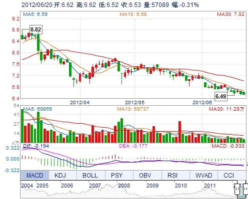 今 開: 6.62 成交量: 57088手 振 幅: 1.53% 最 高: 6.62 成交額: 3741.39萬 換手率: 0.60% 最 低: 6.52 總市值: 68.20億 市凈率: 2.29 昨 收: 6.55 流通市值...