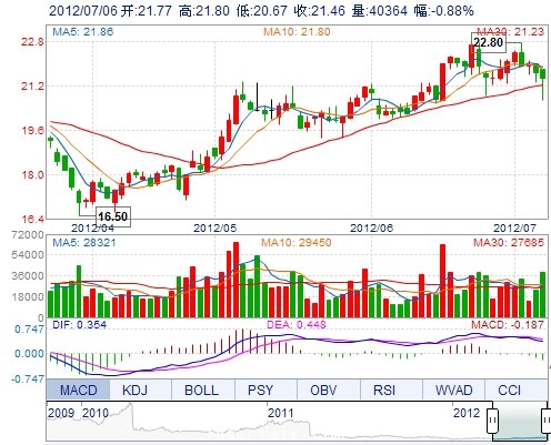 今 開: 21.77 成交量: 40364手 振 幅: 5.22% 最 高: 21.80 成交額: 8549.35萬 換手率: 1.97% 最 低: 20.67 總市值: 63.88億 市凈率: 5.26 昨 收: 21.65 流通...