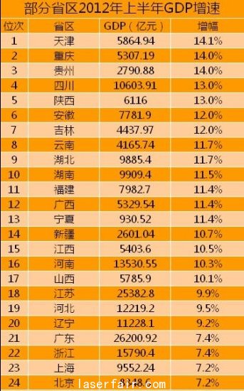 在已經(jīng)公布的這24個(gè)省份中,天津以14.1%的增速居首,重慶(14.0%)和貴州(14.0%)并列第二,而北京和上海一起排名墊底,兩者上半年GDP增速相同,都僅為7.2%。