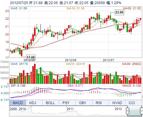 今 開: 21.88 成交量: 20699手 振 幅: 1.79% 最 高: 22.06 成交額: 4532.18萬 換手率: 1.01% 最 低: 21.67 總市值: 65.63億 市凈率: 5.40 昨 收: 21.77 流通...