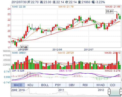 今 開: 22.70 成交量: 21860手 振 幅: 3.76% 最 高: 23.00 成交額: 4925.33萬 換手率: 1.07% 最 低: 22.14 總市值: 65.90億 市凈率: 5.43 昨 收: 22.88 流通...