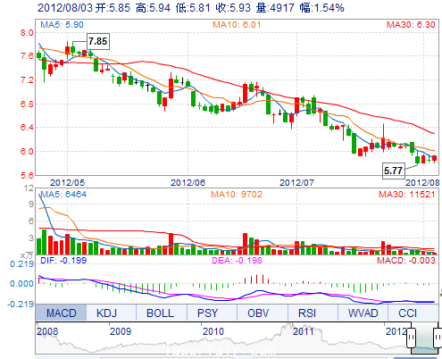 今 開: 5.85 成交量: 4917手 振 幅: 2.23% 最 高: 5.94 成交額: 289.81萬 換手率: 0.18% 最 低: 5.81 總市值: 16.90億 市凈率: 2.71 昨 收: 5.84 流通市值: ...