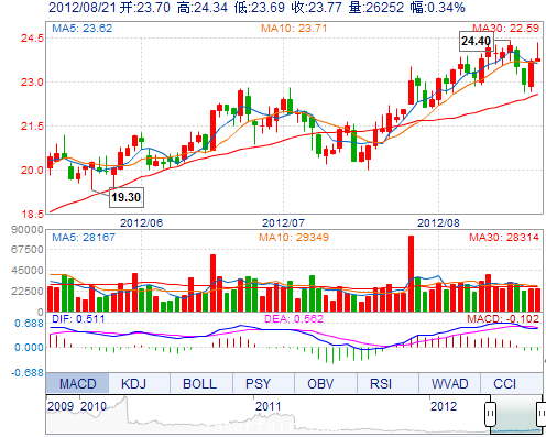 今 開: 23.70 成交量: 26252手 振 幅: 2.74% 最 高: 24.34 成交額: 6308.68萬 換手率: 1.44% 最 低: 23.69 總市值: 70.75億 市凈率: 5.57 昨 收: 23.69 流通...