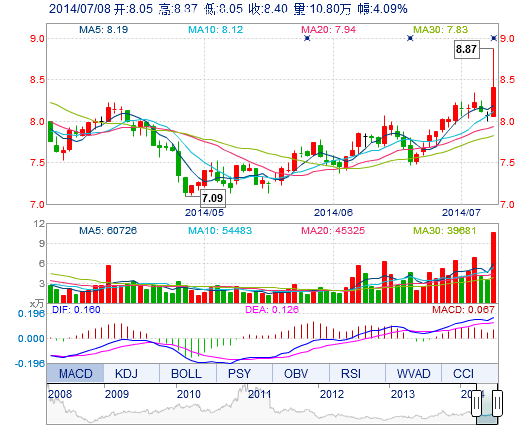 今開: 8.05 成交量: 10.80萬手 振幅: 10.16% 最高: 8.87 成交額: 9122.13萬元 換手率: 3.93% 最低: 8.05 總市值: 23.94億 市凈率: 3.73 昨收: 8.07 流通市值...