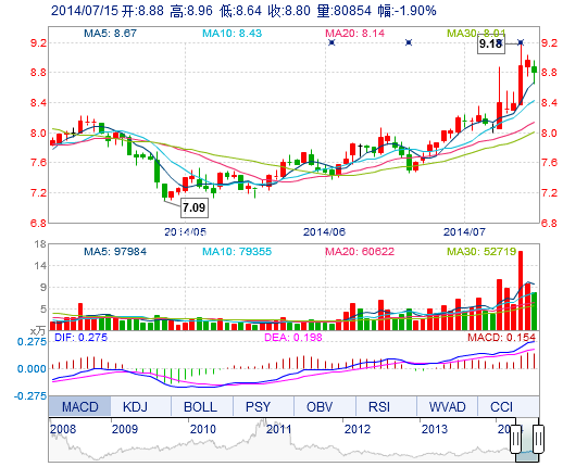 今開: 8.88 成交量: 8.09萬手 振幅: 3.57% 最高: 8.96 成交額: 7110.54萬元 換手率: 2.94% 最低: 8.64 總市值: 25.08億 市凈率: 3.91 昨收: 8.97 流通市值: ...