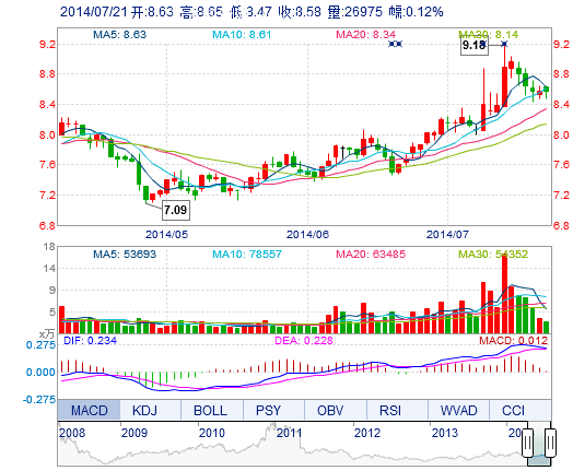 今開: 8.63 成交量: 2.70萬手 振幅: 2.10% 最高: 8.65 成交額: 2307.78萬元 換手率: 0.98% 最低: 8.47 總市值: 24.45億 市凈率: 3.81 昨收: 8.57 流通市值: ...