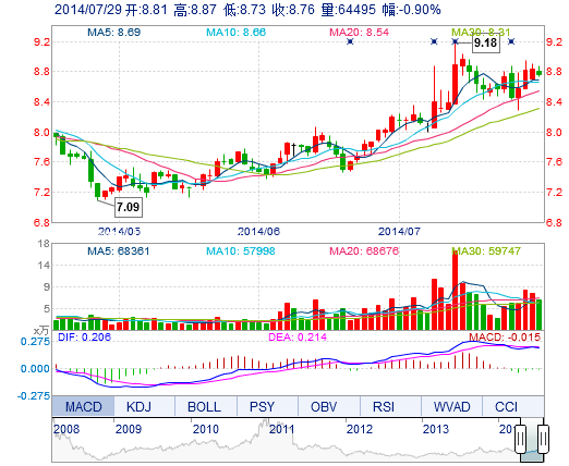 今開: 8.81 成交量: 6.45萬(wàn)手 振幅: 1.58% 最高: 8.87 成交額: 5675.46萬(wàn)元 換手率: 2.35% 最低: 8.73 總市值: 24.97億 市凈率: 3.89 昨收: 8.84 流通市值: ...