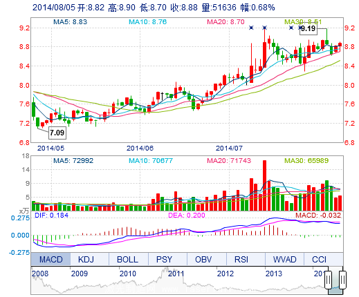 | 今 開: | 8.82 | 成交量: | 5.16萬手 | 振 幅: | 2.27% |