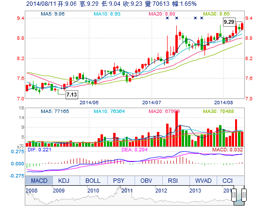 今開: 9.06 成交量: 7.06萬(wàn)手 振幅: 2.75% 最高: 9.29 成交額: 6495.42萬(wàn)元 換手率: 2.57% 最低: 9.04 總市值: 26.31億 市凈率: 4.10 昨收: 9.08 流通市值: ...