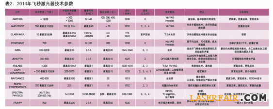 在撰寫這篇文章時(shí),我們與所有參加了2013年調(diào)查的公司進(jìn)行了聯(lián)系,并請(qǐng)他們更新了數(shù)據(jù)。此外,許多不在之前名單上的公司也被邀請(qǐng)參與此次調(diào)查,2013年調(diào)查時(shí)他們或是沒有囊括入名單中,或是不愿意參與,或是當(dāng)時(shí)他們還沒有涉足超短脈沖激光器領(lǐng)域。因此本次的名單更為完整,但這絕不是一個(gè)完整的調(diào)查。名單被劃分為皮秒激光器和飛秒激光器;公司在表中的位置是由他們自己選擇的。