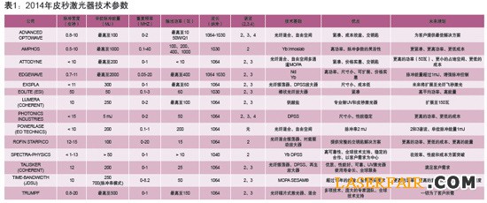 在撰寫(xiě)這篇文章時(shí),我們與所有參加了2013年調(diào)查的公司進(jìn)行了聯(lián)系,并請(qǐng)他們更新了數(shù)據(jù)。此外,許多不在之前名單上的公司也被邀請(qǐng)參與此次調(diào)查,2013年調(diào)查時(shí)他們或是沒(méi)有囊括入名單中,或是不愿意參與,或是當(dāng)時(shí)他們還沒(méi)有涉足超短脈沖激光器領(lǐng)域。因此本次的名單更為完整,但這絕不是一個(gè)完整的調(diào)查。名單被劃分為皮秒激光器和飛秒激光器;公司在表中的位置是由他們自己選擇的。