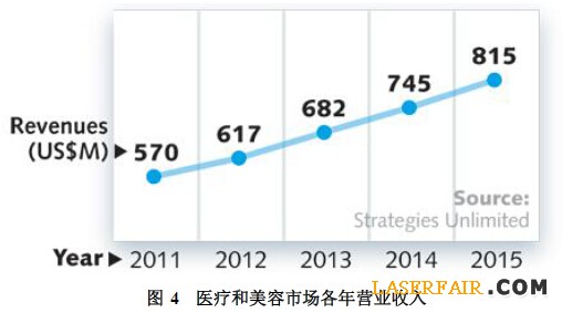 2014年,外科、眼科和美容激光銷售額分別增長(zhǎng)13%、9%、8%,2014年醫(yī)用和美容激光器市場(chǎng)銷售額為7.45億美元,預(yù)計(jì)2015年增長(zhǎng)9%超過(guò)8.15億美元。