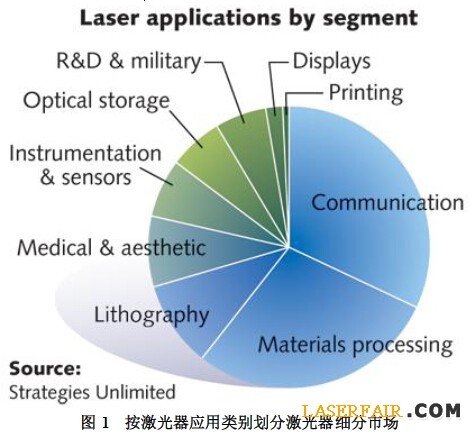 通信和光存儲(chǔ)仍然是激光產(chǎn)業(yè)最大的細(xì)分市場(chǎng),然后是材料加工和光刻激光器市場(chǎng)部分。對(duì)于2014年,醫(yī)療和美容激光產(chǎn)品銷售總額仍然大于儀器和傳感部分,最后是科研和軍事細(xì)分市場(chǎng)。