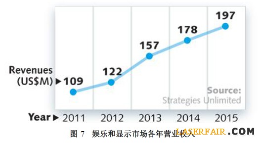 隨著激光影院市場(chǎng)的滲透和激光標(biāo)識(shí)游戲的多樣化,激光照明顯示市場(chǎng)的營(yíng)業(yè)收入持續(xù)固定增長(zhǎng)。事實(shí)上,許多城市正在考慮“消滅”污染,即煙花匯演產(chǎn)生的固體垃圾也將有利于激光燈光秀的發(fā)展。隨著所有激光娛樂(lè)市場(chǎng)的發(fā)展,我們預(yù)測(cè)2015年娛樂(lè)和顯示應(yīng)用的激光市場(chǎng)將增長(zhǎng)近11%達(dá)到1.97億美元。