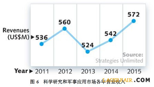 在傳感領(lǐng)域,物聯(lián)網(wǎng)應(yīng)用和智能小工具將使激光制造商保持忙碌幾十年。此外,激光器銷售直接受益于美國(guó)石油和天然氣的繁榮。2013年花在分布式光纖傳感器的費(fèi)用是5.85億美元(預(yù)計(jì)2018年將達(dá)到14.6億美元),根據(jù)2014光子傳感器協(xié)會(huì)發(fā)布的消息,70%的銷售額與石油和天然氣市場(chǎng)細(xì)分相關(guān)。我們預(yù)測(cè),分析、傳感器、儀器儀表和生命科學(xué)激光市場(chǎng)預(yù)計(jì)在2015年增長(zhǎng)7.5%達(dá)到6.62億美元,輕松超過(guò)科學(xué)研究和軍事細(xì)分市場(chǎng)的組合總銷售額。