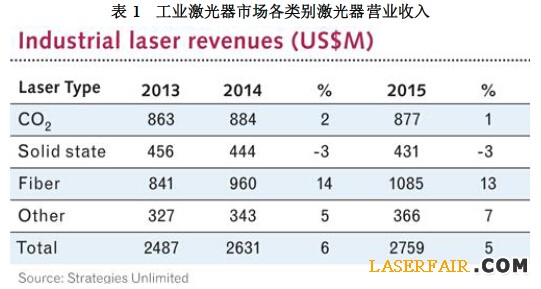 隨著2014年的結(jié)束,用于制造業(yè)的工業(yè)激光市場(chǎng)的整體銷售超過(guò)26億美元,與2013年?duì)I業(yè)收入相比增加了6%(見(jiàn)表1)。2014年,用于材料加工應(yīng)用的光纖激光器占全球激光器市場(chǎng)總營(yíng)業(yè)收入的29%,僅次于通信應(yīng)用領(lǐng)域的激光器市場(chǎng)部分(32%)。全球制造業(yè)的變幻莫測(cè)使激光在光電子領(lǐng)域緊隨其后。