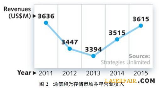 2014年通信和光存儲(chǔ)激光產(chǎn)品市場(chǎng)營(yíng)業(yè)收入達(dá)到35.15億美元,預(yù)計(jì)2015年增長(zhǎng)2.8%達(dá)到36.15億美元。盡管2014年大多數(shù)通信激光供應(yīng)商的財(cái)務(wù)狀況是良好的,但是戴爾的Oro集團(tuán)預(yù)測(cè)2015年通信設(shè)備投資支出將會(huì)下降,原因是高級(jí)移動(dòng)設(shè)備滲入、移動(dòng)數(shù)據(jù)增長(zhǎng)緩慢、缺乏新的收入來(lái)源以及發(fā)展中和未開(kāi)發(fā)市場(chǎng)的競(jìng)爭(zhēng)加劇。然而考慮到光通信正推動(dòng)“物聯(lián)網(wǎng)(IOT)”,這種預(yù)測(cè)令人相當(dāng)費(fèi)解:為了遠(yuǎn)程監(jiān)控和診斷實(shí)現(xiàn)云連接,還有一大堆沒(méi)有被命名的“智能”應(yīng)用。
