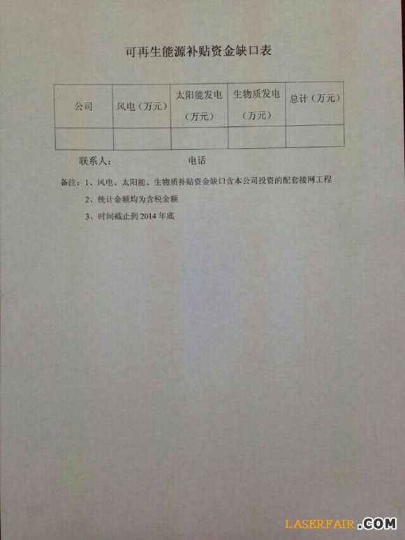 2015年4月9日,國家能源局向各有關(guān)可再生能源發(fā)電企業(yè)發(fā)布【特急】關(guān)于請(qǐng)?zhí)峁┛稍偕茉囱a(bǔ)貼資金缺口的函?! 『赋觯簽?/p>