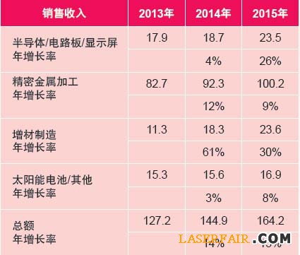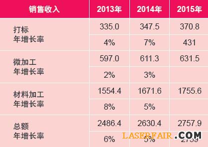 表4將微加工分為三個大的分類以及雜項,從表中我們能看到半導(dǎo)體工業(yè)(一個典型的周期性行業(yè))的設(shè)備訂單下滑帶來的影響。再加上精密金屬加工這個主要行業(yè)的不確定性,導(dǎo)致2014年的銷售收入下降了2%。不過積極的一面是,3D打印技術(shù)煥發(fā)出極大的活力,引起了持續(xù)而廣泛的關(guān)注。這提高了眾多工業(yè)對增材制造(用高功率激光直接金屬沉積技術(shù)來制造零部件)的接受度。最終在這一領(lǐng)域的激光器銷售收入增加了34%,并且在2015年還會有更大的增長潛力,預(yù)期增長率將達(dá)到62%。