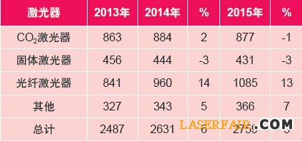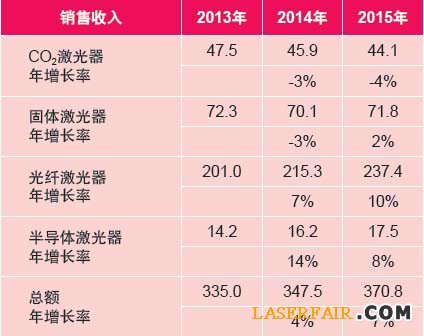 表1:工業(yè)激光器的銷售收入(貨幣單位:百萬美元)