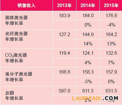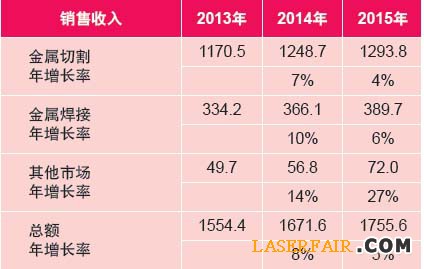 不考慮2014年全球制造業(yè)的增長,在光纖激光器產(chǎn)銷兩旺的勢頭的推動下,工業(yè)激光器的銷售同比2013年平均增加了6%。在表1中,我們根據(jù)領(lǐng)先的供應(yīng)商在2014年初發(fā)表的年度業(yè)績報告,而對2013年的總銷售數(shù)字進(jìn)行了調(diào)整。