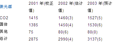表1 全球工業(yè)激光系統(tǒng)產(chǎn)值(百萬美元)(%增長率)