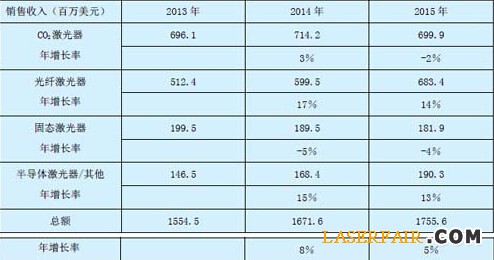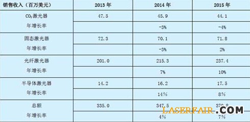 表1:所有的工業(yè)激光材料加工市場的銷售收入(貨幣單位:百萬美元)